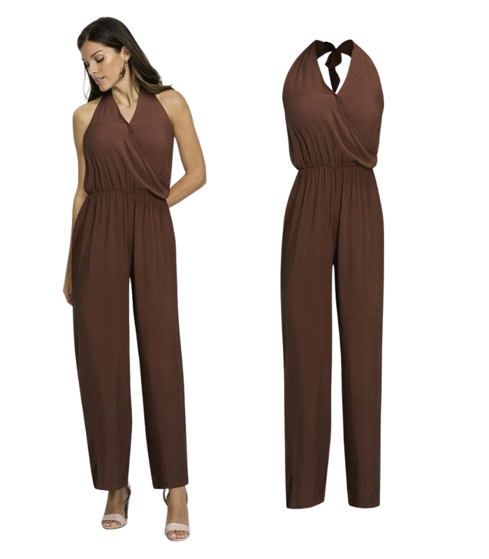 Planejado para agradar mulheres que buscam peças práticas e elegantes, este macacão é perfeito em qualquer época do ano. Use-o com sandálias delicadas nos meses mais quentes ou adicione um blazer estiloso nos dias mais frios. Independente de como você o combina, o Macacão Longo Decote Transpassado Marrom Escuro é uma peça curinga indispensável no seu guarda-roupa.